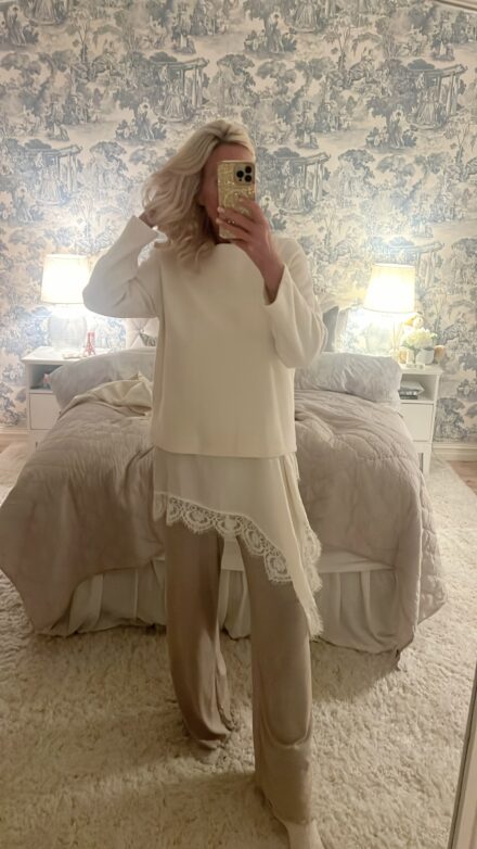 På kvällen hade J planer med vänner så jag hoppade i mina myskläder (byxorna är en del av en super skön pyjamas från H&M, ett tips!) och passade på att prova en topp som jag hittat hos Zara. Jag älskar alla dessa toppar som har “inbyggt” linne ! det kryllar av dom hos Zara just nu och jag skulle vilja ha alla, men både jag och J föll till slut för denna… Tänker att den blir super fin till jeans + boots.